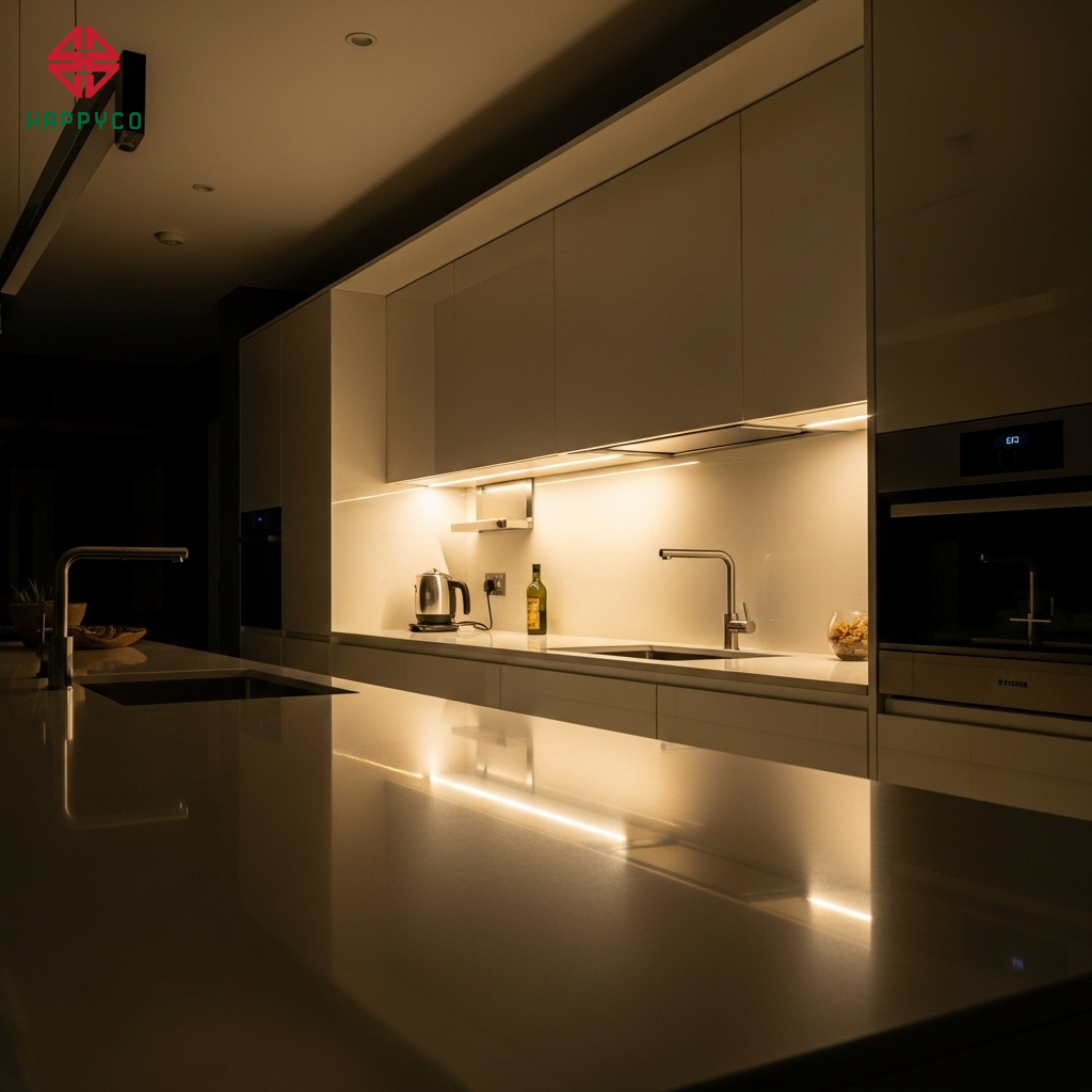 Hoàn thiện sắc nét: Dưới ánh đèn rọi trực tiếp, sự chỉn chu trong từng đường dán cạnh và độ phẳng của bề mặt thi công của Happyco sẽ hiện lên rõ nét nhất, minh chứng cho đẳng cấp "nói được, làm được" của chúng tôi.