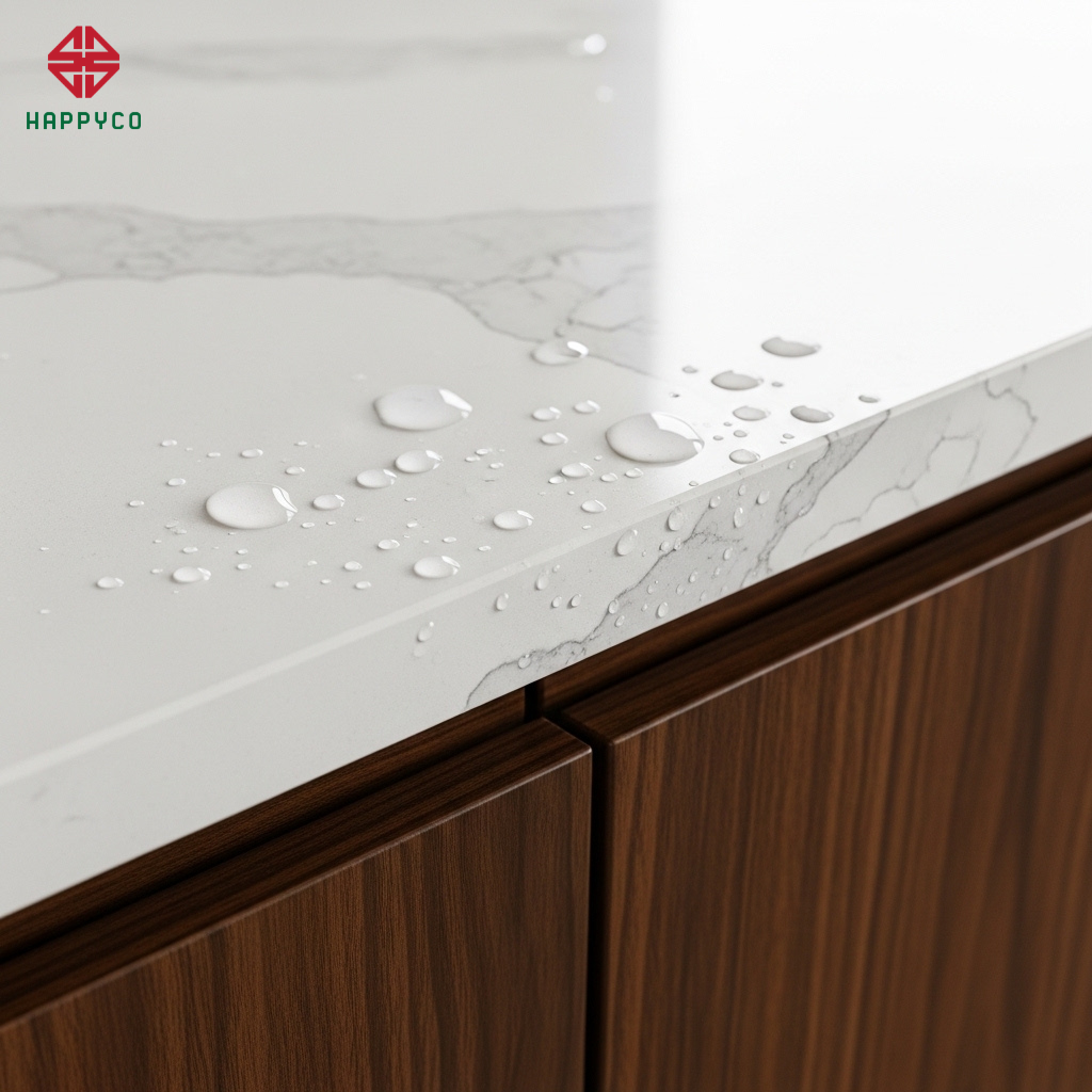 Liên kết không vết nối: Happyco xử lý các điểm giao giữa mặt đá và vách kính bếp bằng kỹ thuật chuyên sâu, loại bỏ hoàn toàn các đường ron lộ liễu. Bề mặt đá thạch anh mịn màng không chỉ chống thấm ố mà còn cực kỳ dễ vệ sinh.