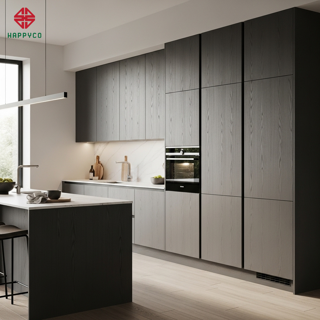 Tích hợp tinh tế: Happyco thực hiện kỹ thuật thi công âm tủ tuyệt đối cho tủ lạnh, lò nướng, máy rửa bát. Các thiết bị được giấu kín sau cánh tủ gỗ kịch trần, tạo nên một bề mặt phẳng lỳ, đồng nhất.