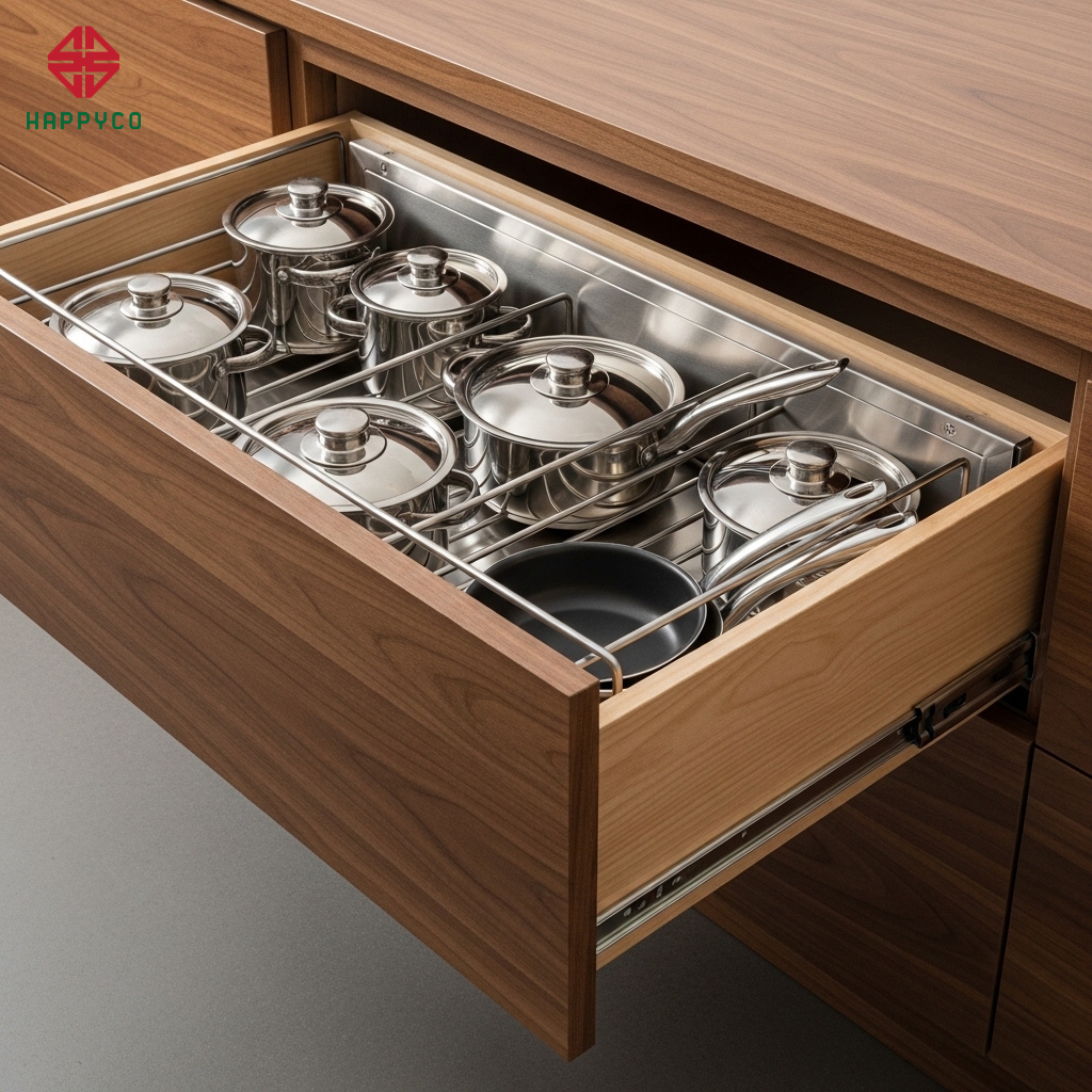 Chuyển động tĩnh lặng: Mọi hệ ray trượt và bản lề tại Happyco đều được lắp đặt và căn chỉnh khắt khe để đảm bảo sự êm ái tuyệt đối, không gây tiếng động, mang lại cảm giác dễ chịu mỗi khi sử dụng.