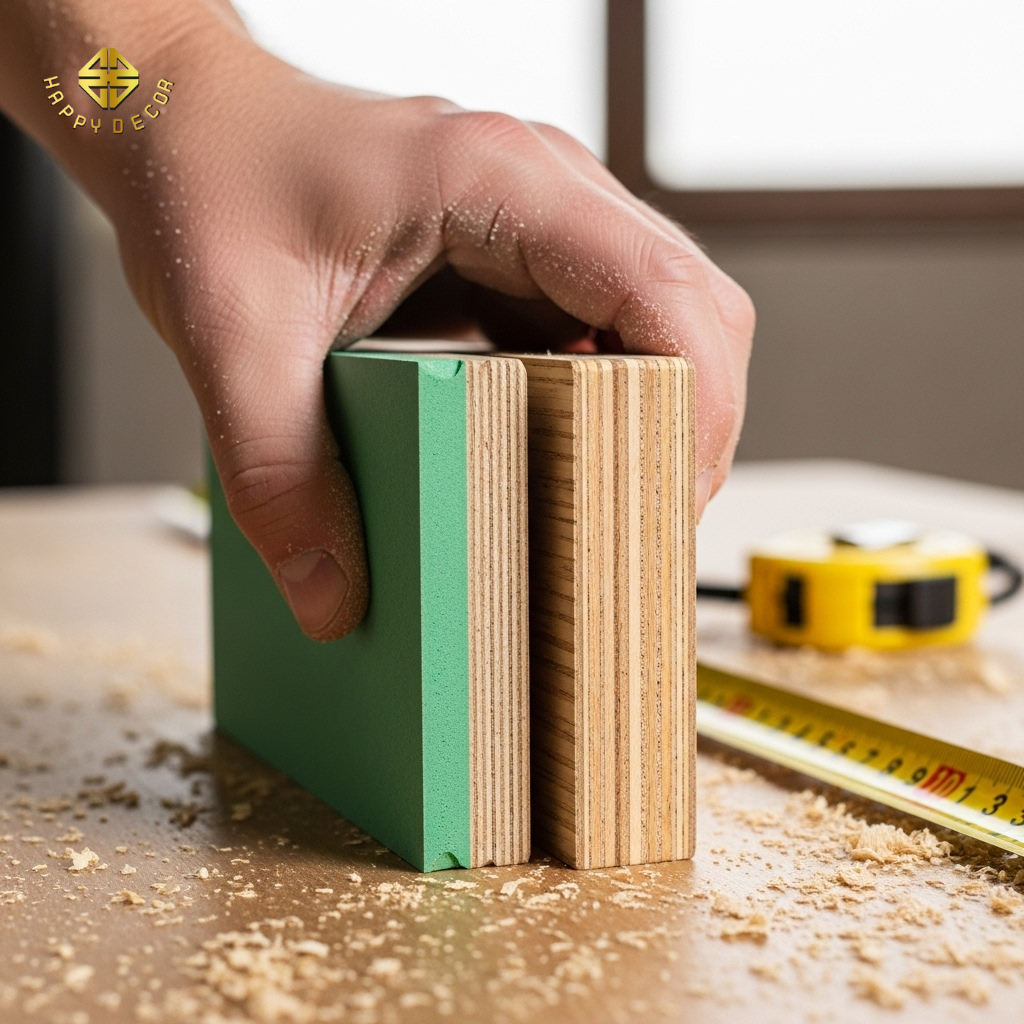 Plywood (Gỗ dán): Đây là dòng vật liệu cao cấp đang lên ngôi. Được cấu tạo từ các lớp gỗ tự nhiên lạng mỏng ép chồng lên nhau, Plywood có khả năng chịu lực cực tốt và kháng nước cao hơn MDF rất nhiều. Trong một báo giá chuyên nghiệp, những vị trí "nhạy cảm" như tủ bếp hay tủ lavabo bắt buộc phải dùng Plywood hoặc nhựa đặc Picomat để đảm bảo không bị trương nở khi gặp nước.
