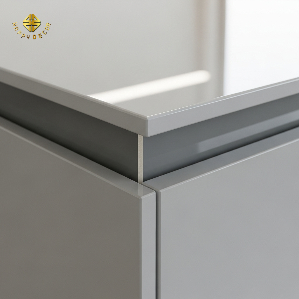 Acrylic (Bóng gương): Tạo không gian sang trọng, hiện đại và có chiều sâu. Acrylic cao cấp phải được dán cạnh "không đường line" (Zero-line) bằng máy chuyên dụng. Nếu một xưởng mộc báo giá Acrylic rẻ bất ngờ, hãy kiểm tra xem họ dán cạnh thủ công hay dán máy, vì độ bền và thẩm mỹ của hai loại này khác nhau một trời một vực.