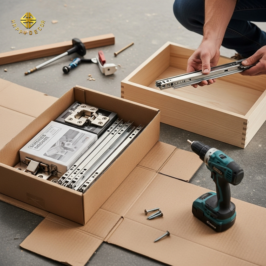 Phụ kiện đi kèm: Bản lề giảm chấn inox 304 chính hãng (Blum, Hafele, Garis) có giá cao gấp 5-10 lần so với bản lề sắt thông thường. Nhiều xưởng mộc giảm giá thành bằng cách "trộn" phụ kiện rẻ tiền vào những vị trí khuất, khiến bộ tủ nhanh chóng bị xệ cánh hoặc rỉ sét.