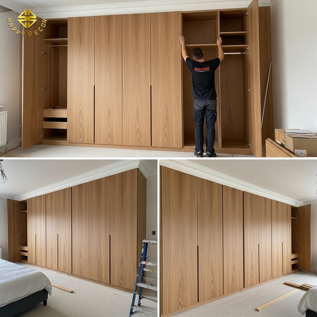Gia cường lõi thép và ván HDF Black: Với các hệ tủ có nhịp dài, Happy Décor gia cố hệ khung xương âm bên trong bằng gỗ HDF nén tỷ trọng cao hoặc khung xương thép chịu lực. Điều này giúp hệ tủ chịu được tải trọng hàng trăm kg mà vẫn giữ được độ phẳng tuyệt đối của cánh tủ.