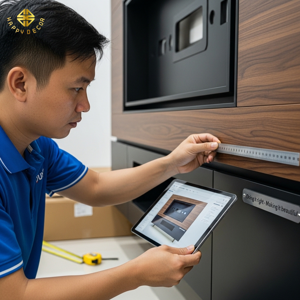 Bản vẽ chuẩn, gia công chuẩn nhưng lắp đặt sai sẽ làm hỏng toàn bộ công trình. Đội ngũ kỹ thuật của Happy Décor sử dụng công nghệ đo đạc hiện đại nhất để đảm bảo kết quả cuối cùng.