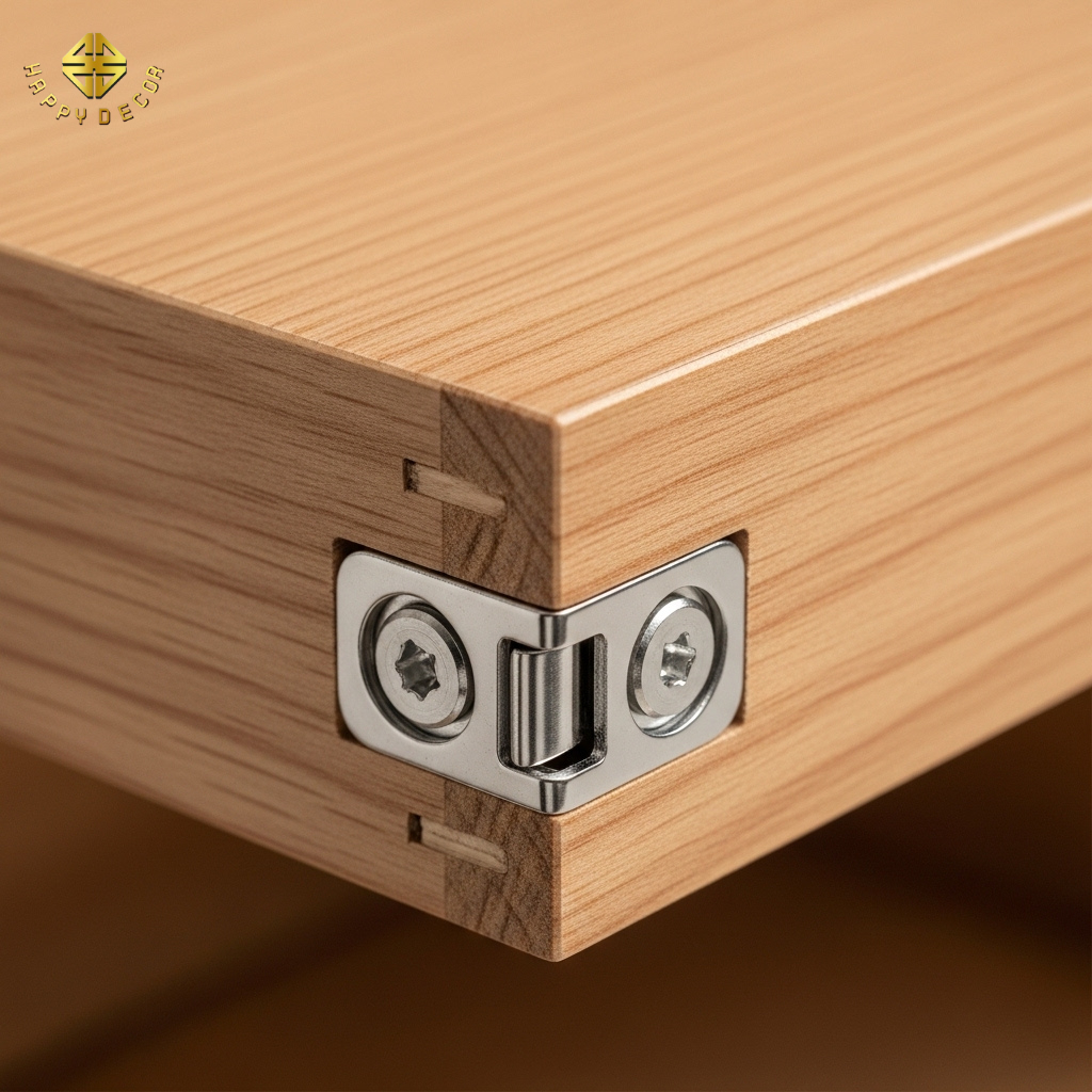 Thẩm mỹ "không tì vết": Thay vì bắn vít trực tiếp từ bên ngoài rồi dùng miếng dán che đậy thô kệch, Happy Décor sử dụng hệ liên kết Cam-chốt âm hoàn toàn vào lõi ván HDF. Khi nhìn vào bề mặt tủ, khách hàng sẽ không thấy bất kỳ một dấu vết kim loại nào, tạo nên một khối mộc liền mạch, phẳng lì và đẳng cấp.