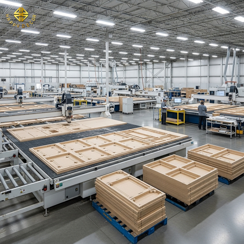 Gia công CNC chính xác: Mọi chi tiết nội thất tại Happy Décor được module hóa và cắt bằng máy CNC trung tâm từ các tấm ván Kho Mộc lớn. Việc tính toán sơ đồ cắt bằng phần mềm giúp tối ưu hóa diện tích ván, giảm thiểu tỷ lệ gỗ thừa xuống dưới 5%.