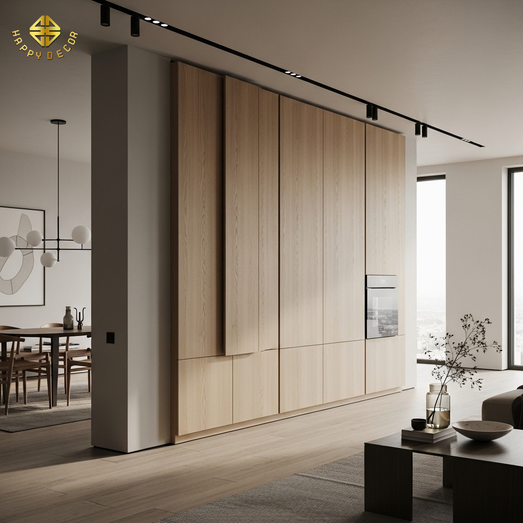Bề mặt giả lập 4D: Thay vì dùng gỗ tự nhiên cho toàn bộ hệ tủ, Happy Décor tư vấn sử dụng ván phủ Melamine hoặc Laminate với hiệu ứng vân gỗ Sồi, Óc chó hoặc vân đá nung kết. Với kỹ thuật dán cạnh Noline, sự khác biệt về thẩm mỹ gần như bằng không, nhưng chi phí giảm tới 40 - 60%.