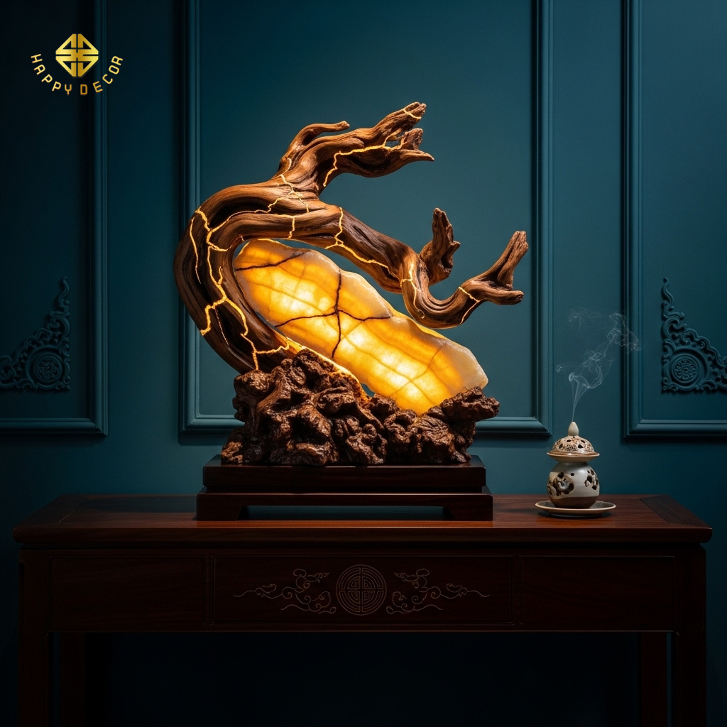 Hiệu ứng thị giác: Khi đèn tắt, nó là một khối gỗ mộc mạc. Khi đèn bật, ánh sáng xuyên qua các vân đá và thớ gỗ nứt nẻ, tạo nên một tác phẩm nghệ thuật ánh sáng đầy mê hoặc, biến phòng khách thành một không gian triển lãm đậm chất cá nhân.