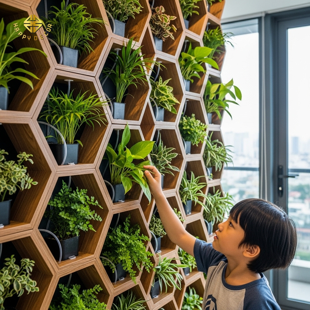 Lợi ích: Hệ thống này tự động chăm sóc cây, gia chủ không cần tốn thời gian nhưng vẫn luôn có một "lá phổi xanh" trong nhà giúp lọc bụi mịn và cung cấp oxy tươi liên tục.