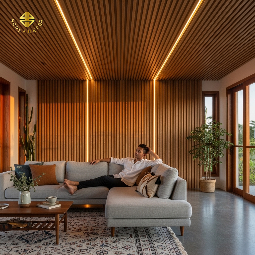 Cơ chế hoạt động: Buổi sáng, ánh sáng có sắc xanh (Cool white) giúp gia chủ tỉnh táo; buổi tối, ánh sáng chuyển dần sang vàng cam đậm (Warm amber) hắt qua các thớ gỗ, kích thích cơ thể tiết ra melatonin để chuẩn bị cho giấc ngủ sâu.