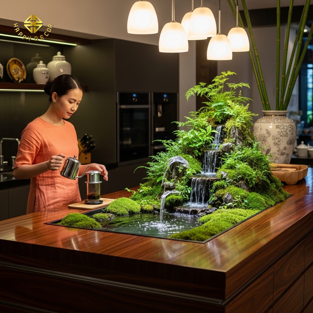 Giải pháp kỹ thuật: Happy Décor thiết kế các hệ bàn đảo bằng gỗ Gõ Đỏ hoặc gỗ Sồi được xử lý chống thấm tuyệt đối (Marine-grade coating). Ở giữa bàn đảo là một hệ thống bể thủy sinh hoặc vườn rêu (Moss wall) bán cạn âm sàn.
