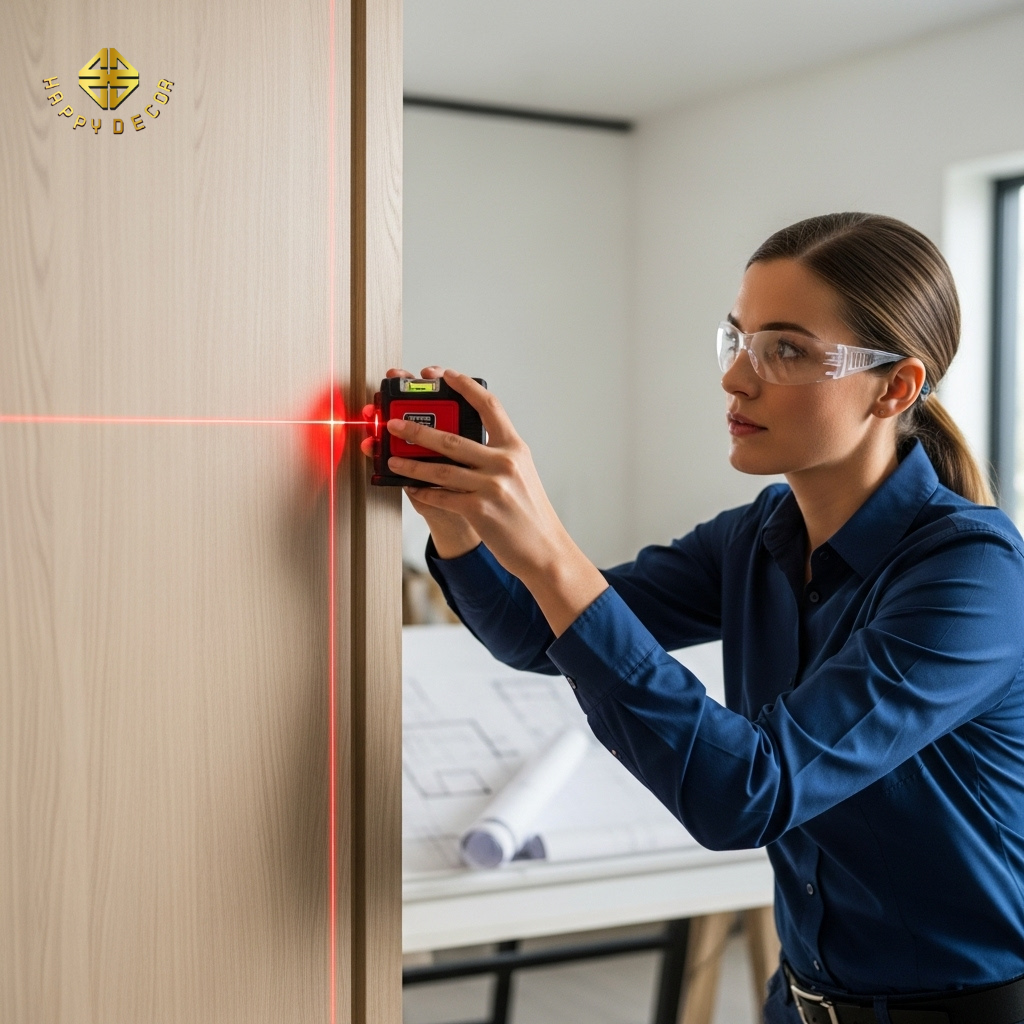 Giám sát: Hãy dùng thước Laser để kiểm tra độ thẳng của tường trước khi đặt hàng nội thất. Nếu tường quá nghiêng, bạn cần báo ngay cho xưởng mộc để họ chủ động cộng thêm phần nẹp chỉ trong bản vẽ sản xuất.