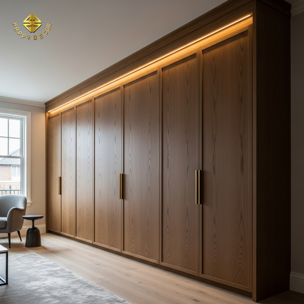 Lưu ý thẩm mỹ: Với phong cách hiện đại, hãy chọn loại phào phẳng, trơn và cùng màu với cánh tủ. Điều này tạo cảm giác hệ tủ cao vút và vững chãi, xóa bỏ cảm giác vụn vặt của những khe hở tối màu trên đỉnh tủ.
