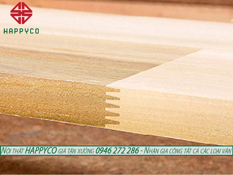 Đầu các thanh gỗ ngắn sẽ được xẻ thành các mối răng cưa so le, sau đó ghép lại với nhau tạo thành các thanh gỗ có chiều dài bằng nhau. Các thanh gỗ tiếp tục được ghép song song tạo thành tấm gỗ lớn. Trên bề mặt tấm ván có vết ghép hình răng cưa.