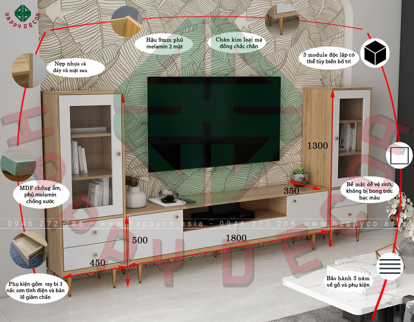 – Kích thước kệ tivi: D1800 x S350 x C500 (mm)