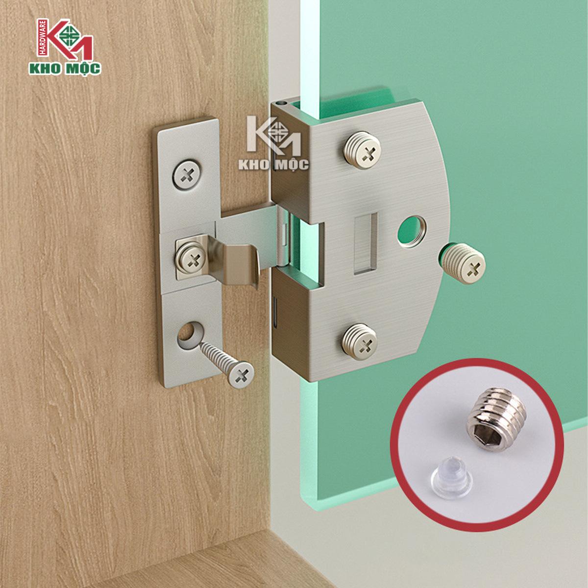 - Ứng dụng: Bản lề Lắp cánh kính hồi gỗ, nhựa hoặc nhôm cho tủ rượu, tủ trang trí, tủ trưng bày... không khoan kính.