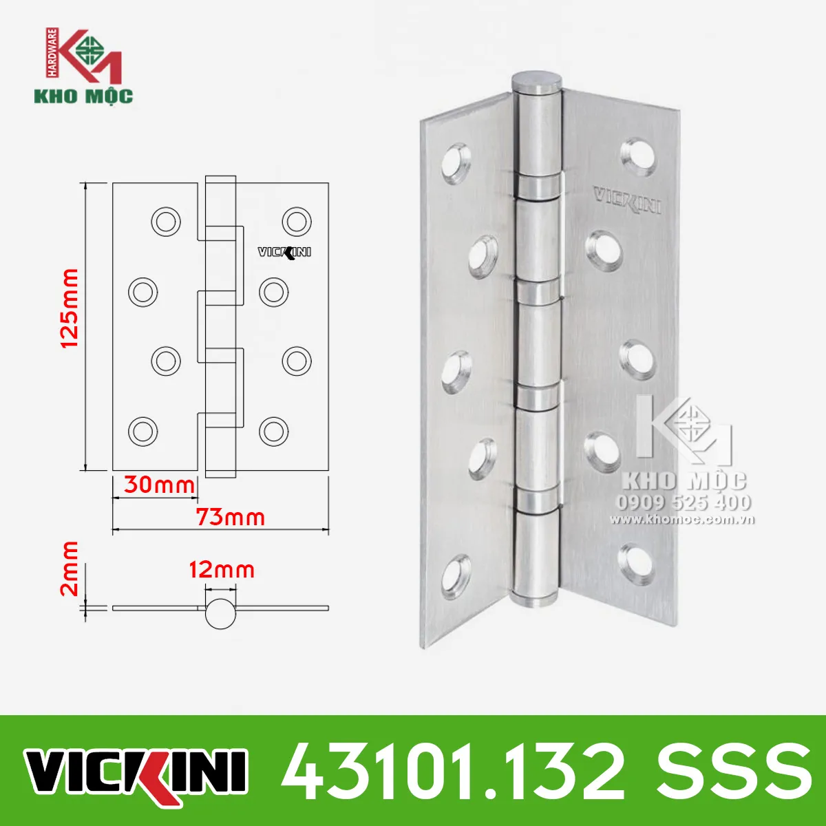 Bản lề cửa gỗ 4 bi Vickini 43101.132 SSS Inox 201. Kích thước 125x73x2mm. Tải trọng 50kg