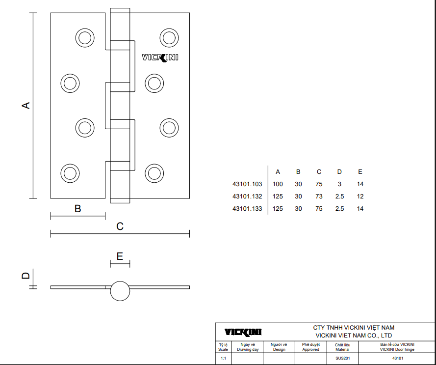 Bản lề cửa Vickini 43101.103 SSS inox mờ