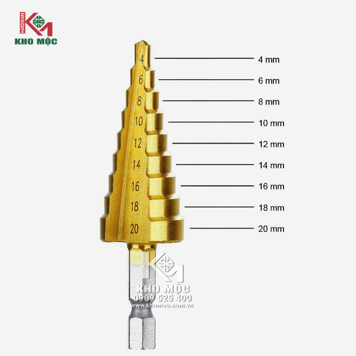 + Mũi 4-20 gồm: 4, 6, 8, 10, 12, 14, 16, 18 và 20mm