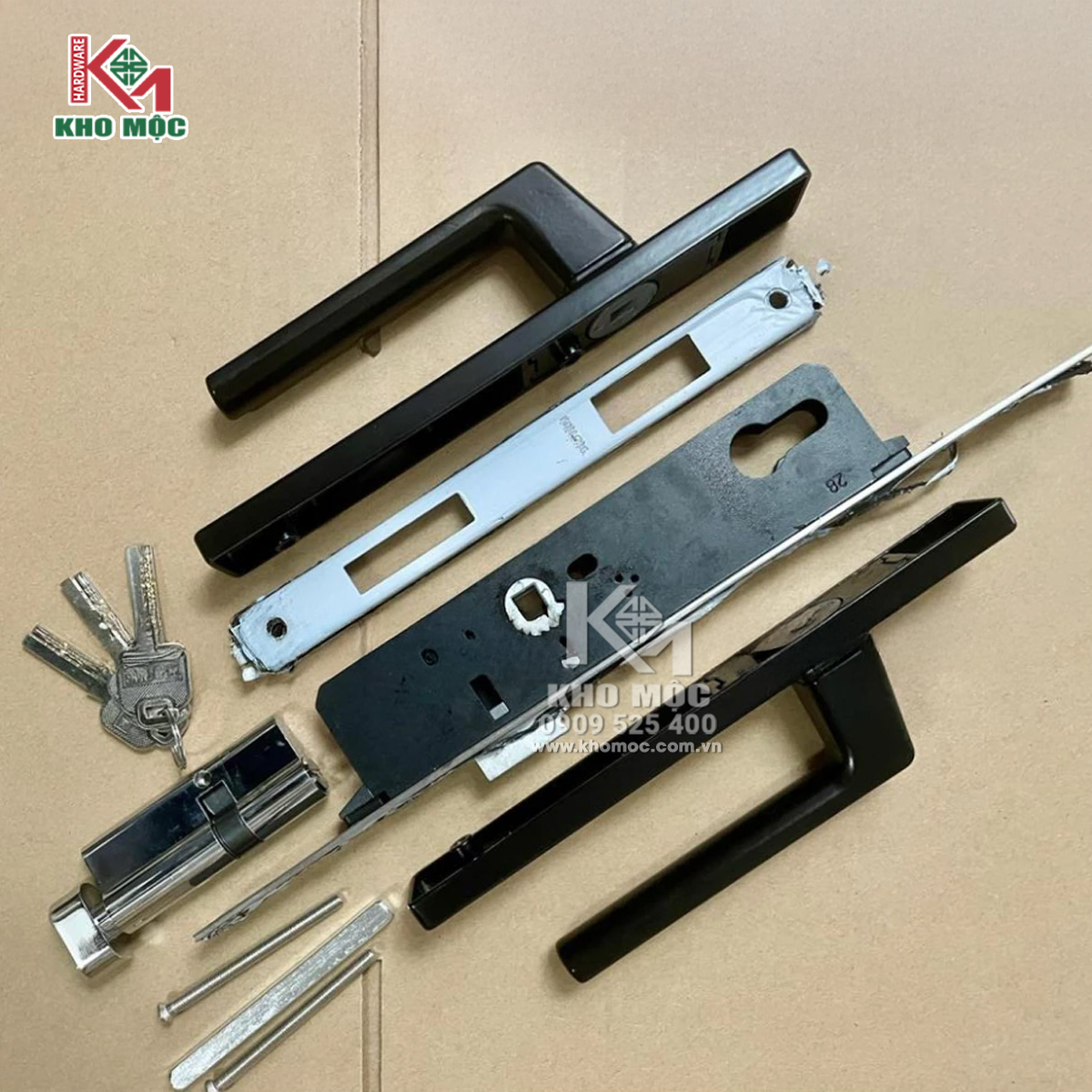_ Bao gồm: Cặp tay nắm cửa, Thân khoá, Hộp tim khoá (củ tim, 3 chìa vi tính, vít tim), Miệng khoá, Cốt tim và 2 ốc bắt