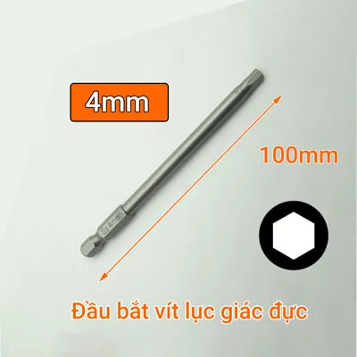 Đầu bắt vít lục giác đực Φ4 dài 100 mm chuôi lục được làm từ thép S2 với độ bền cao, chịu lực, chịu nhiệt tốt. Đây là phụ kiện lắp vào máy khoan ,máy bắn vít để bắt,tháo vít nhanh hơn so với dùng tay vặn tuốc nơ vít thông thường. Đầu bắt vít lục giác đực cho phép bắt các con vít có mũ vít dạng lục giác,