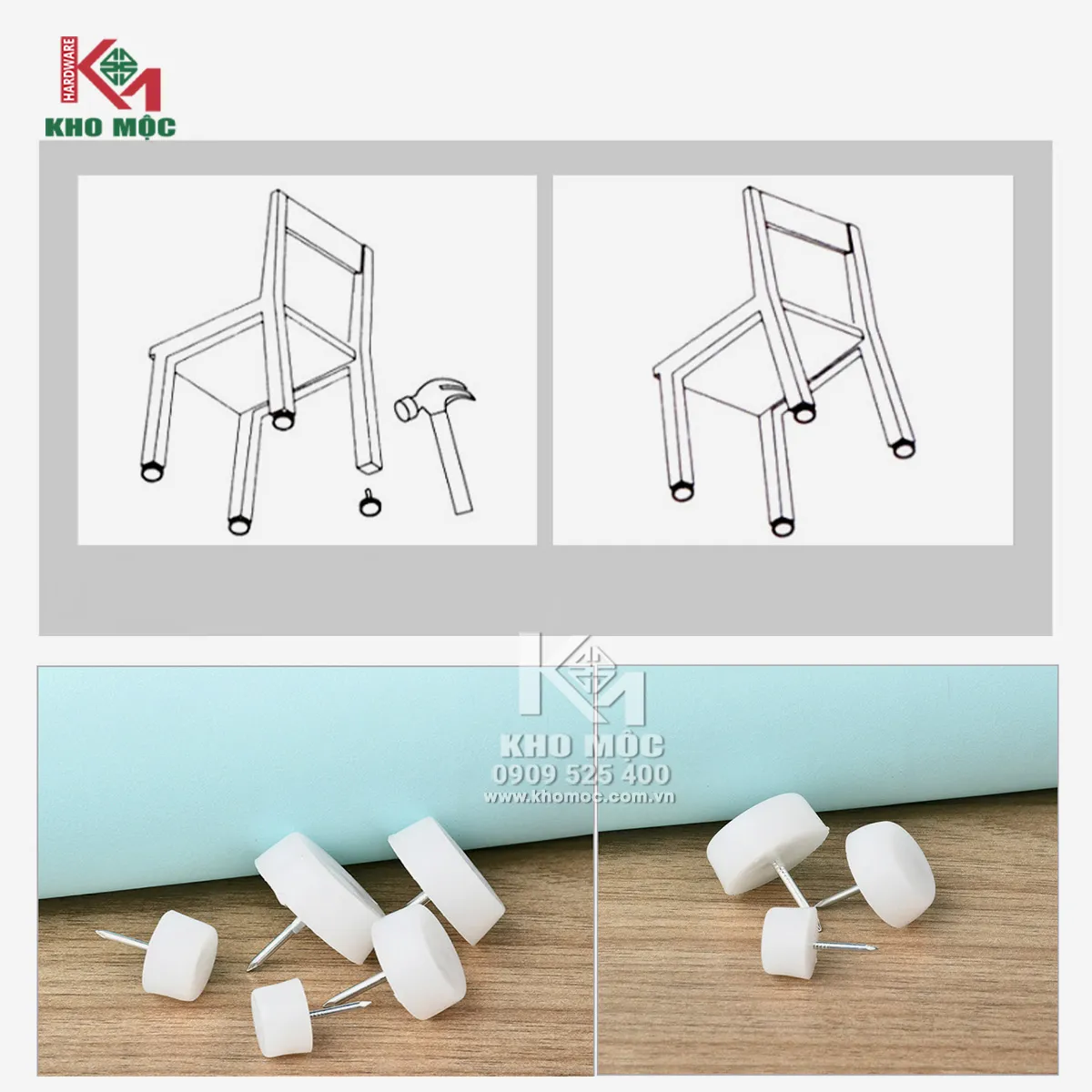 Sản phẩm gia công đúc nhựa kết hợp đinh thép dùng đóng vào các vị trí chân bàn ghế, chân tủ.