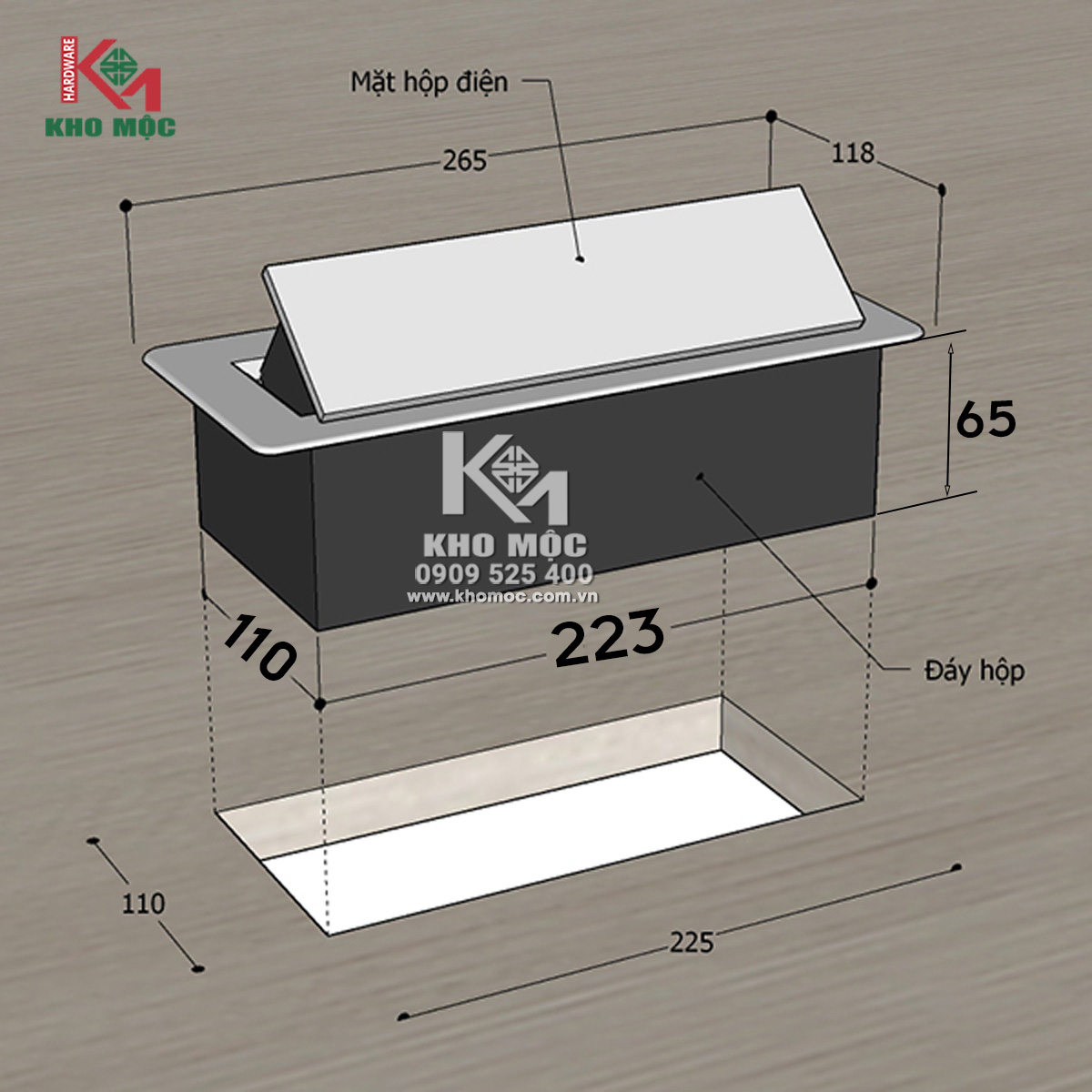 – Kích thước nắp hộp: R265 x S118 x C68 (mm)