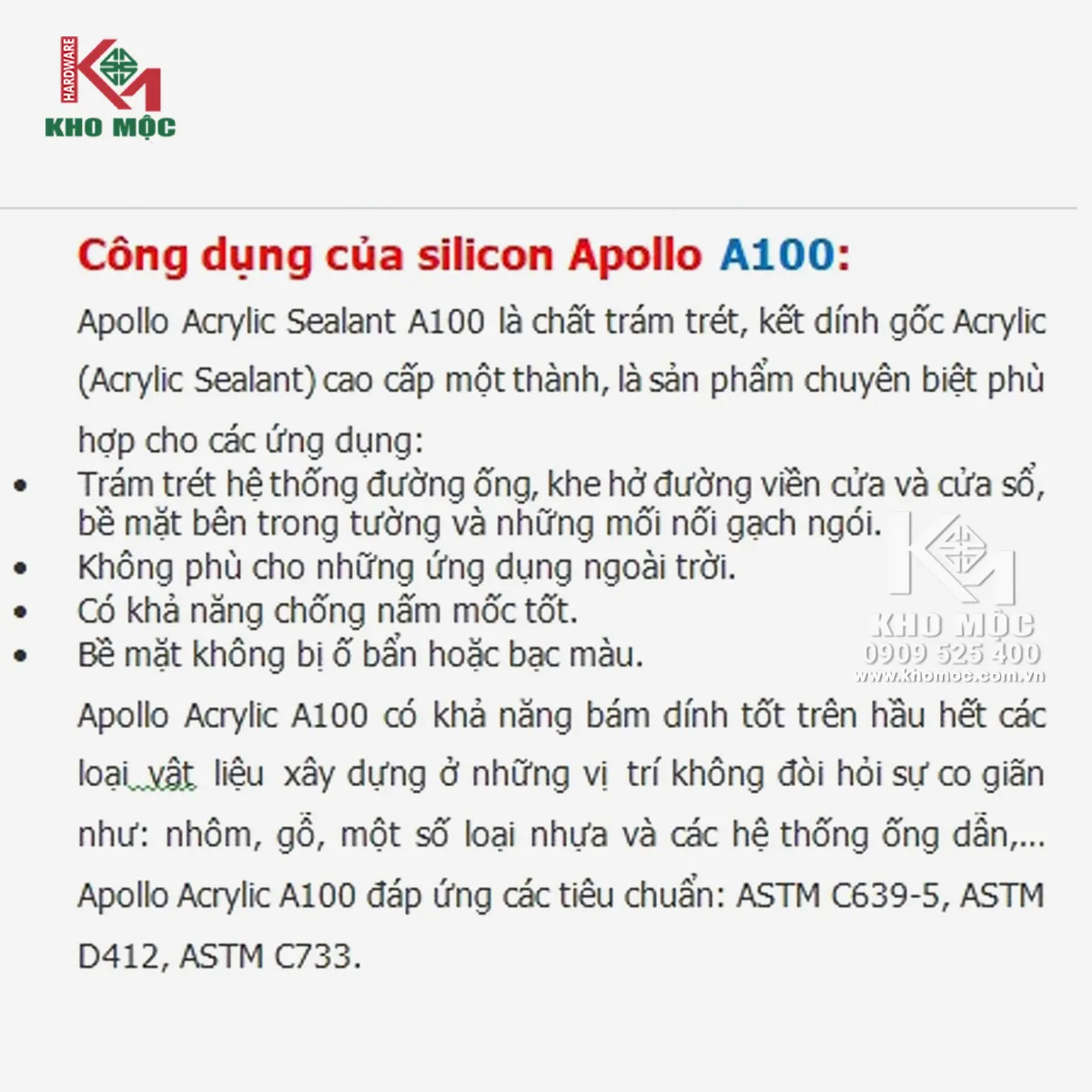 ++ Keo silicone Apollo A100 là chất trám acrylic cao cấp, là sản phẩm chuyên biệt phù hợp cho các công trình: