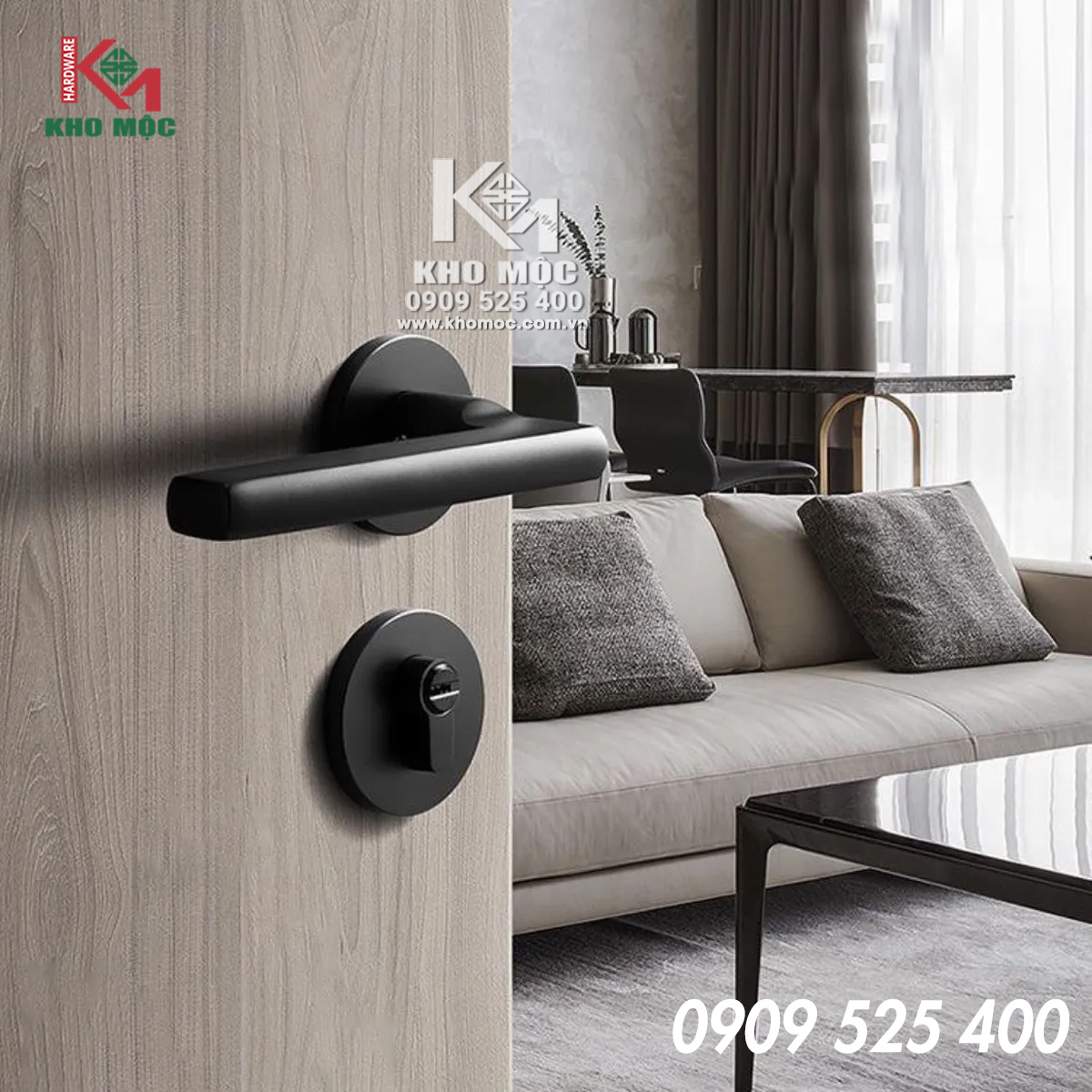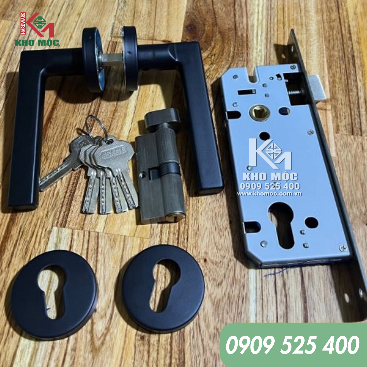 _ Bộ sản phẩm đựng trong hộp giấy gồm: Cặp tay gạt cửa, 2 miệng tim khoá, lõi khoá, 5 chìa vi tính, thân khoá, cốt, vít bắt tim, vít bắt khoá.