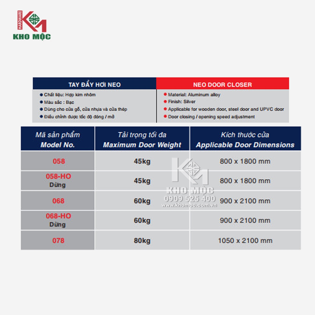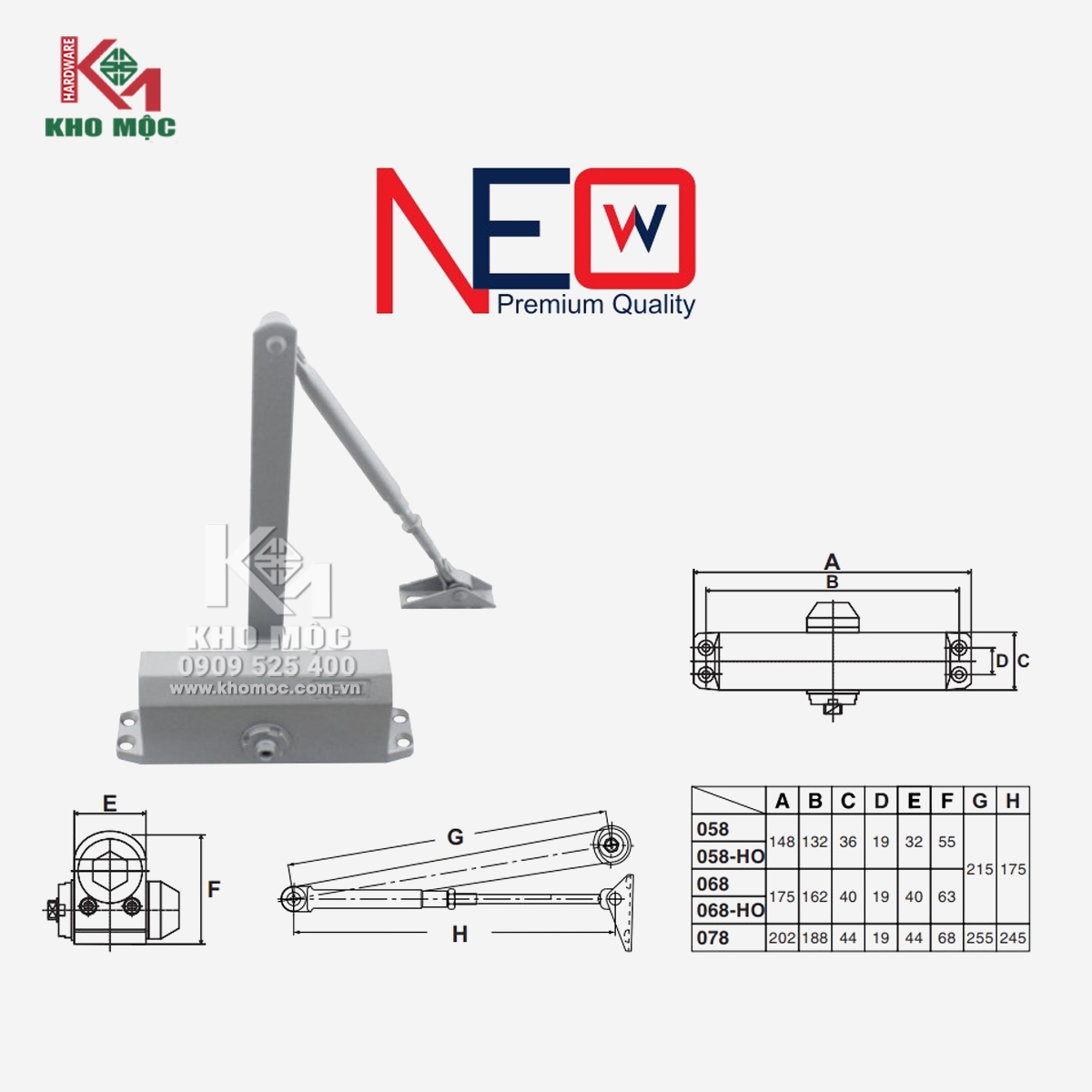 Tay co thủy lực NewNeo 068-HO – giải pháp đóng cửa tự động hoàn hảo cho cửa nặng từ 45-60 kg. Với chức năng giữ cửa thông minh, điều chỉnh tốc độ đóng, sản phẩm từ hợp kim nhôm mang lại độ bền cao, phù hợp cho cửa gỗ, cửa sắt, cửa nhôm, cửa nhựa. Lựa chọn lý tưởng cho nhà ở, văn phòng, showroom!