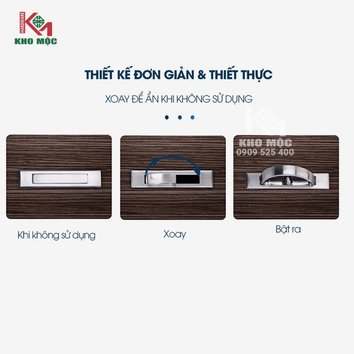 Tay nắm âm xoay ẩn tay nắm phù hợp lắp cho cánh nàm ngang như: cánh hộc giường, bục phản ...