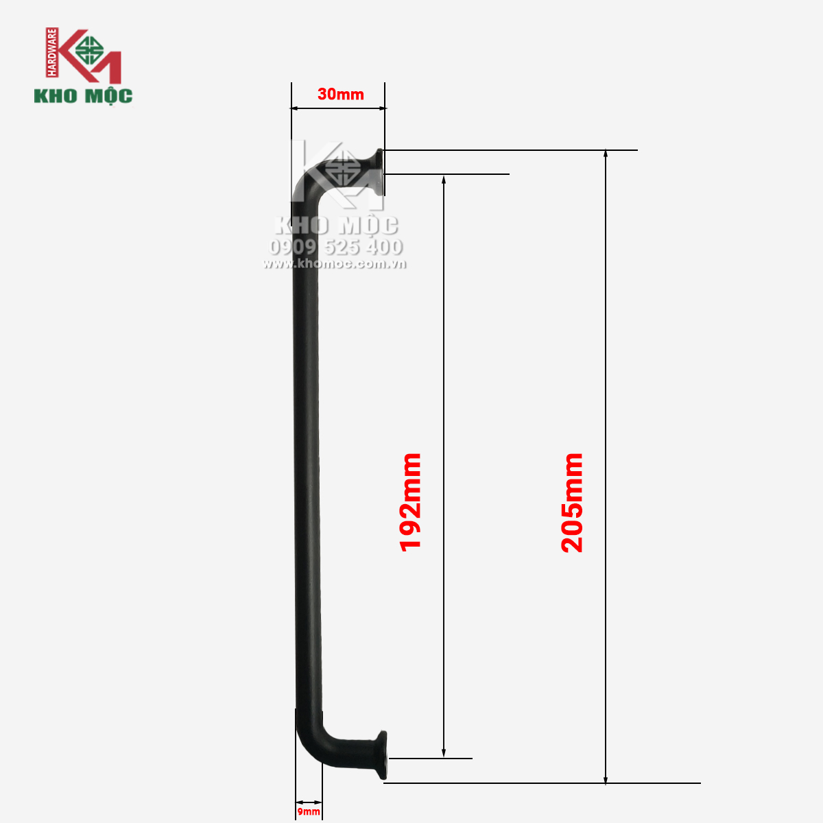 khoảng cách 2 lỗ vít 192mm, tổng dài 208mm, đường kính tay nắm 9mm