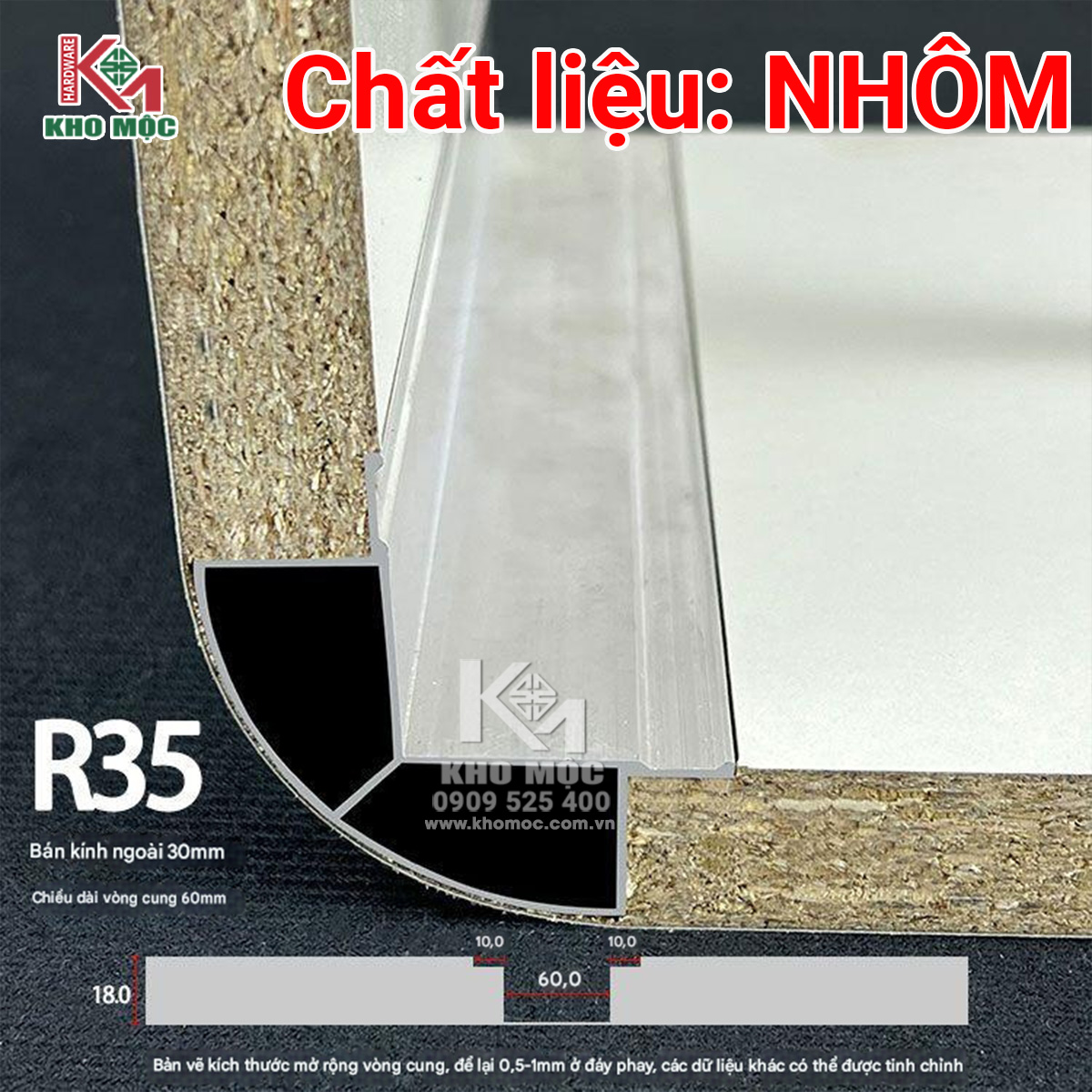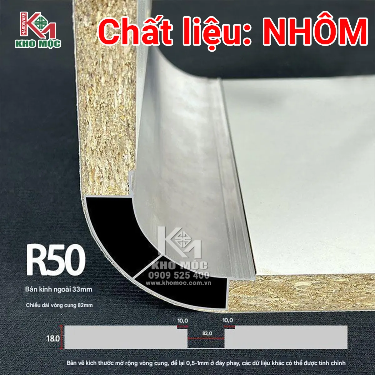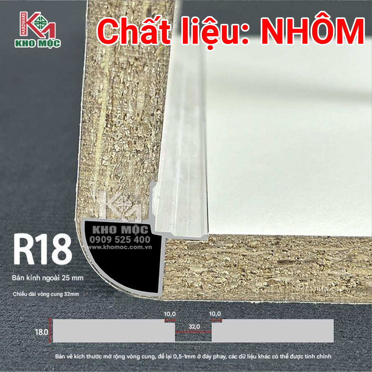 Đây là loại thanh dưỡng có bán kính cong của góc bo là 18mm. Với đường cong nhỏ, góc bo R18 thường được ứng dụng để bo cạnh kệ, bàn,… giúp tạo ra các đường bo tinh tế, thẩm mỹ.