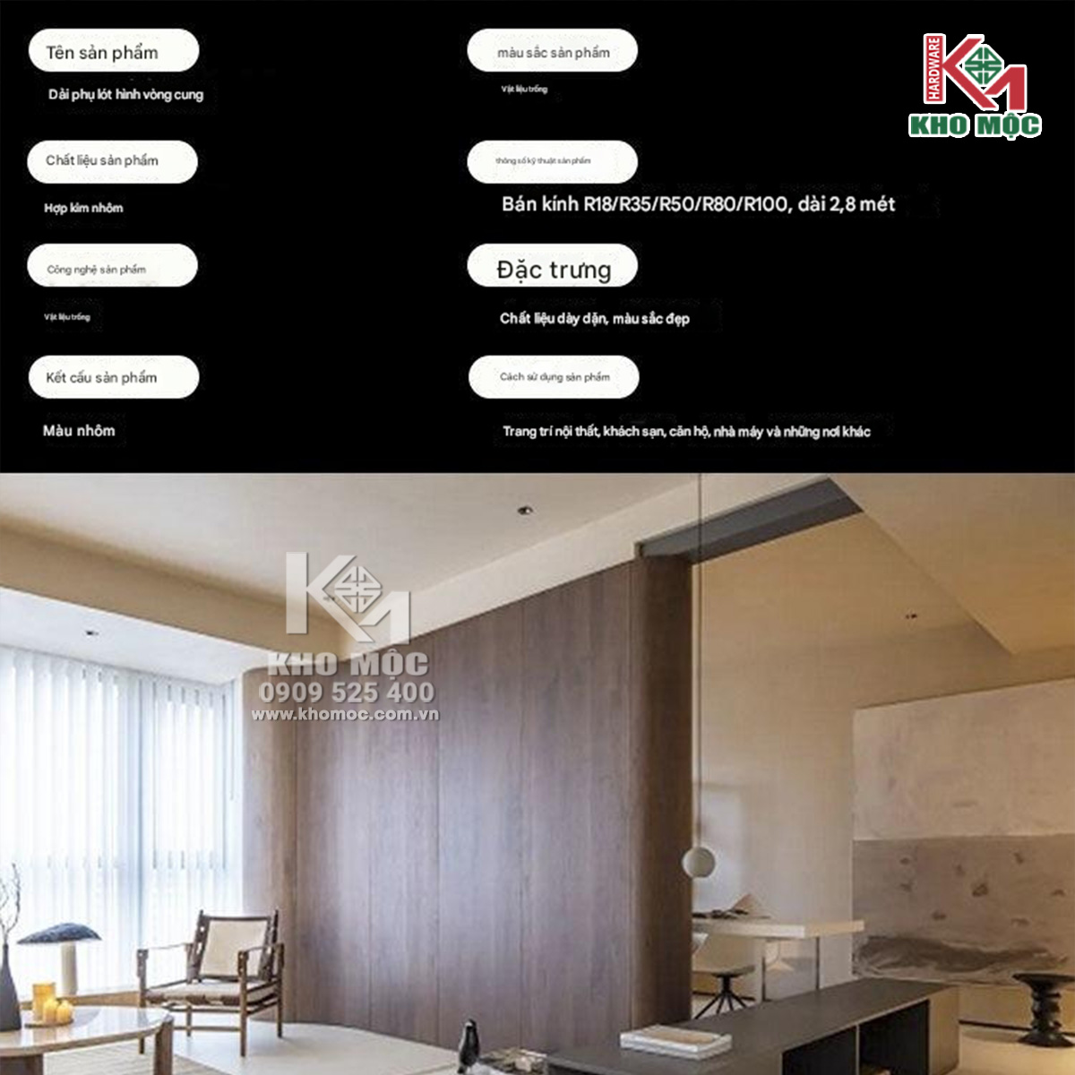 Loại góc bo R50 thường được ứng dụng rộng rãi trong các thiết kế nội thất hiện đại. Với bán kính cong 50mm, thanh dưỡng nhựa bo cong loại này giúp tạo ra các cạnh bo cong lớn và mềm mại. Góc bo R50 phù hợp với nhiều loại bề mặt và thiết kế như tường, góc tường, sàn…