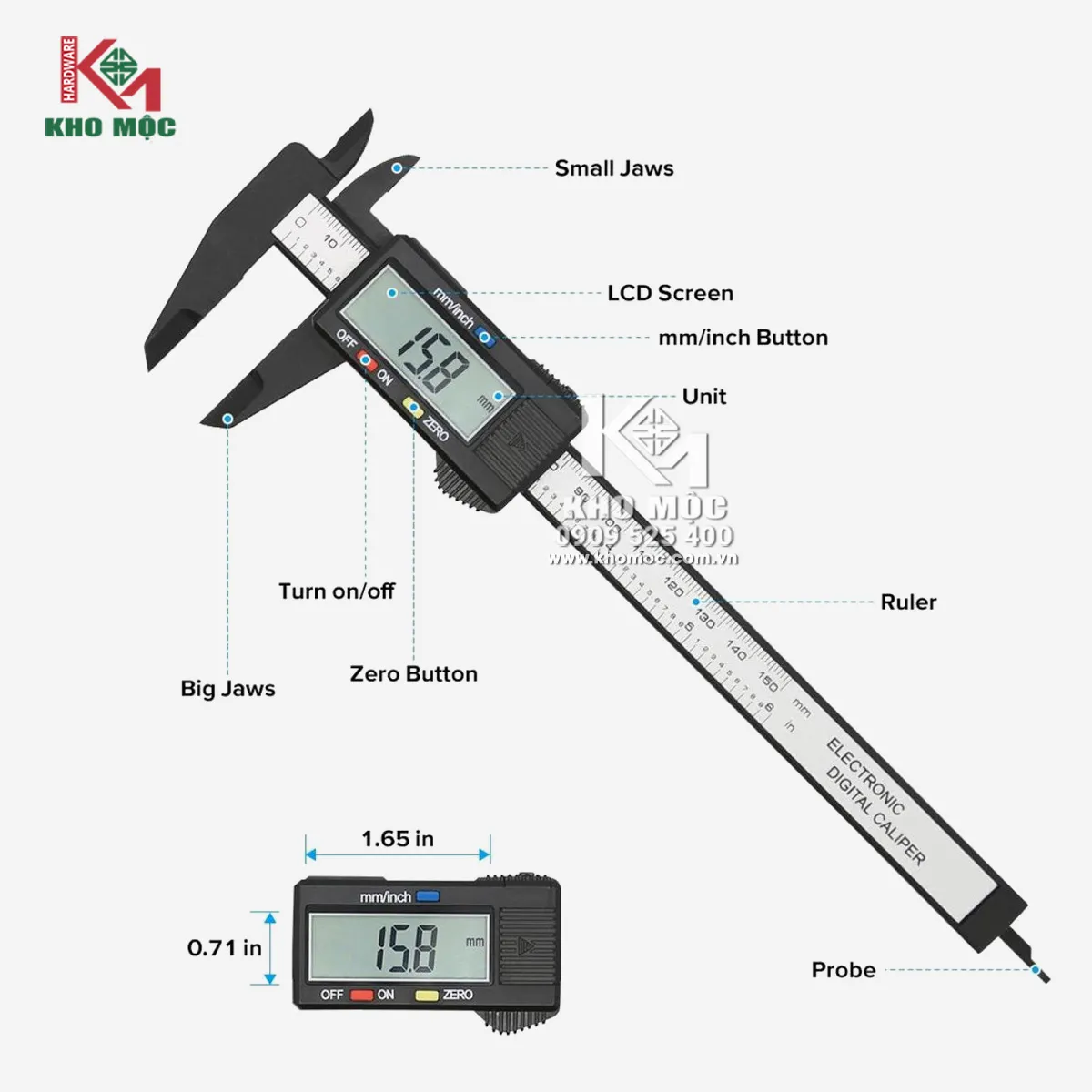 Thang đo từ 0-150mm / 0-6", độ phân giải 0.1mm / 0.01", giúp bạn đạt được kết quả đo lường chính xác nhất.