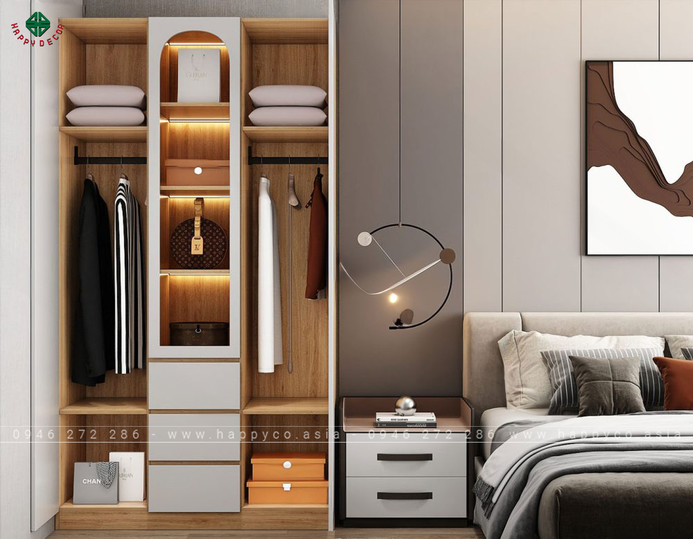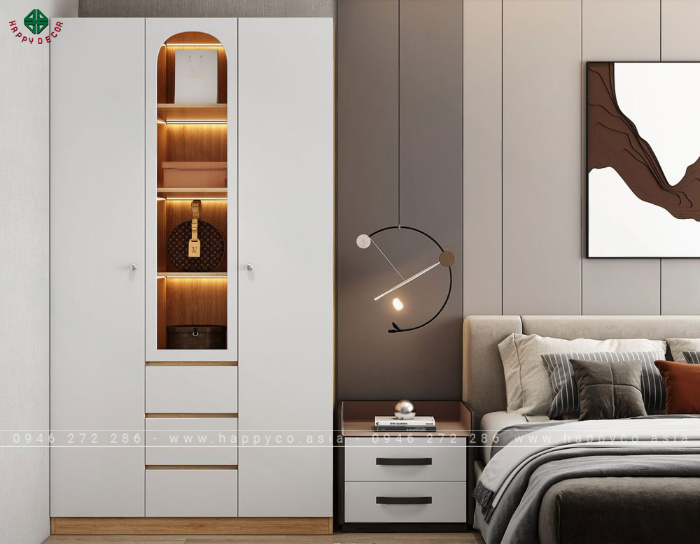 - Tủ quần áo TA6814 được thiết kế 2 khoang lớn với 2 cánh mở được chia làm các ngăn và khoang treo đồ khác nhau, giữa tủ là hệ thống 3 ngăn kéo và 3 đợt trang trí có gắn led hiện đại giúp tối ưu diện tích lưu trữ mà còn mang lại giá trị thẩm mỹ cao cho sản phẩm.